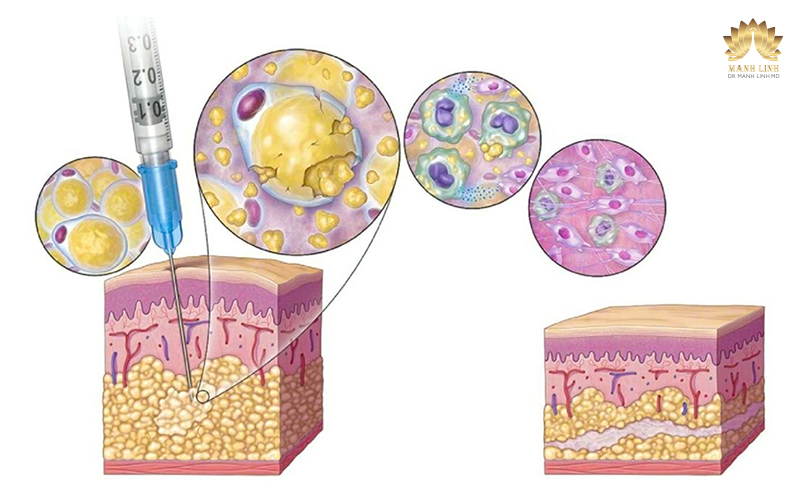 Bác sĩ trực tiếp thực hiện tiêm bổ sung dưỡng chất hủy mỡ nhập khẩu từ Châu Âu vào dưới mô da, đúng liều lượng chỉ định.